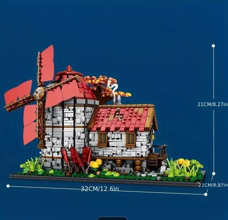 Ez a prémium minőségű, 2296 darabból álló MOC építő készlet egy látványos, középkori stílusú szélmalmot ábrázol, amely elkészítés után dísztárgyként, gyűjteményben vagy diorámában is megállja a helyét. A kész modell egy több szintes házból, téglamintás falazatból, fa hatású építészeti elemekből és mozgatható malomlapátokból áll.